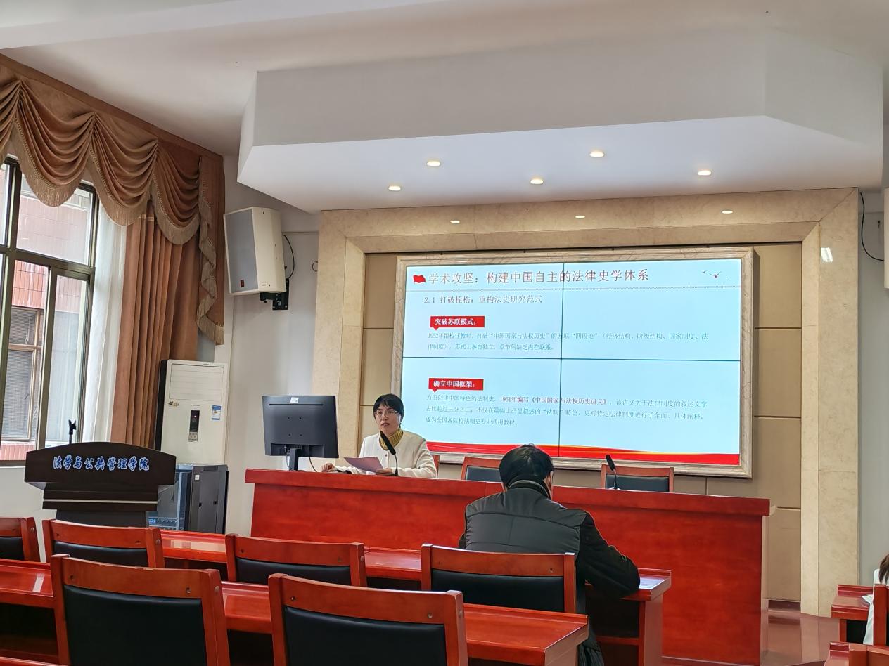 洪婕同志对人民教育家——中国法制史学科的主要创建者和杰出代表张晋藩先生的事迹进行了介绍,重点回顾了他为了“不让我们的子孙去国外学中国法制史”,打破桎梏,重构法史研究范式,主持编写《中国法制通史》多卷本的历程,并在治学生涯中,不断开风气之先河,构建了中国自主的法律史学体系,让中国法律史学走向世界。