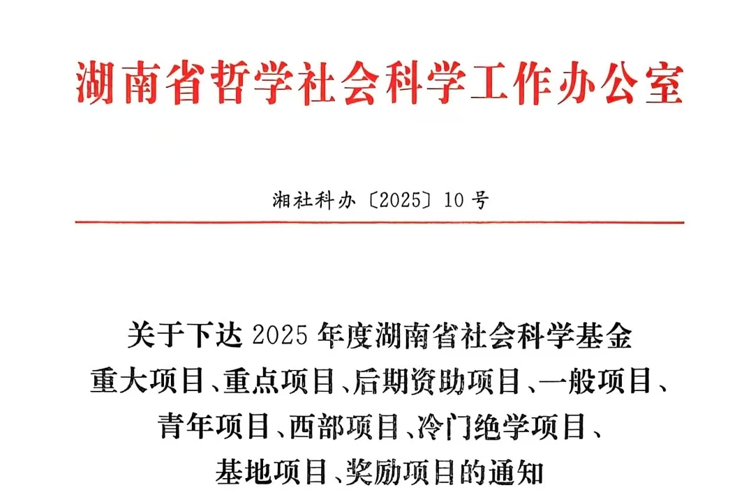 近日,湖南省哲学社会科学工作办公室公布了2025年度湖南省社会科学基金项目立项名单,无码av影片成功获批4项。其中,一般项目两项,青年项目两项。