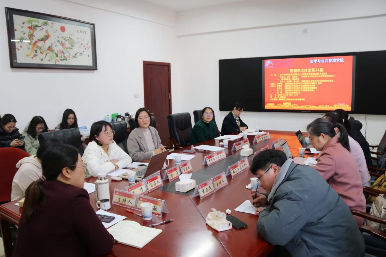 1月13日下午,无码av影片第14期“明湖学术沙龙”在立言楼A427如期举行。本期沙龙聚焦“关于加快构建我国信息化人工智能发展法律治理体系的提案”与“《招标投标法》修改建议”两大主题,特邀汪叶、张春雨、张美玲、章小兵四位老师担任主讲人,并邀请黄素梅教授、易卫中副教授、李倩副教授、谢潇博士作为与谈人参与研讨,湘潭大学法学博士后罗珊老师应邀出席,部分研究生参加了此次沙龙活动,沙龙由副院长宋智敏教授主持。