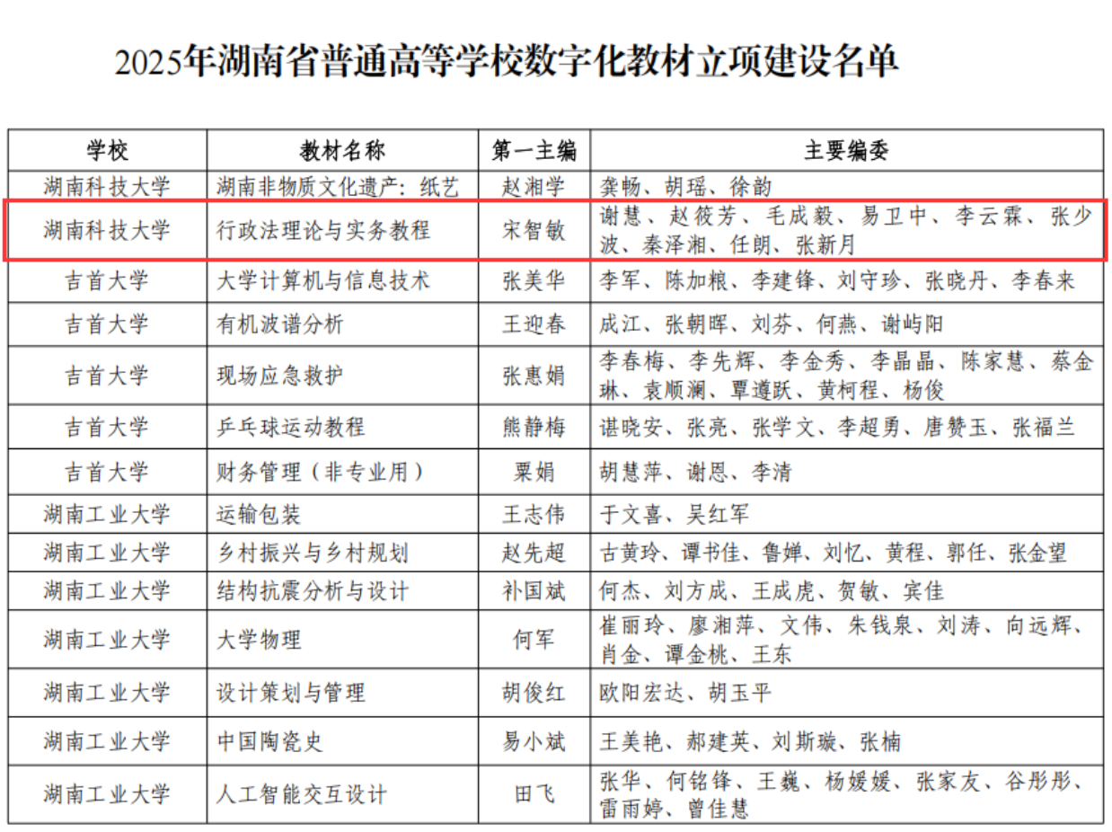 近日,湖南省教育厅正式公布了2025年度普通高等学校数字化教材立项建设评审结果。由无码av影片宋智敏教授主持申报的《行政法理论与实务教程》教材项目,经单位推荐、专家评审与公示程序,成功入选省级数字化教材立项建设名单。